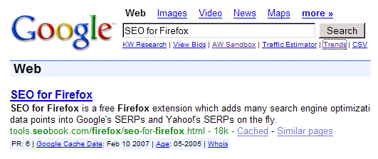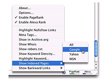 Cледующий весьма полезный инструмент для работы – это расширение SearchStatus. Оно сможет заменить вам Google Toolbar, показывая значение PageRank. Конечно, это не единственная полезная фича: с помощью SearchStatus можно поглядеть AlexaRank, Whois, robots.txt, метатеги, линки, исследовать сайт на Archive.org, рассчитать Keyword Density – и это еще не полный перечень возможностей. Лично я чаще всего использую этот экстеншн для просмотра вражеских Whois .