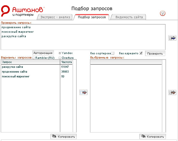 Раздел «Подбор запросов» позволяет отобрать ключевые слова необходимые для продвижения. Механизм работы с ним такой: выбираешь приблизительные запросы, а затем, уже основываясь на статистике запросов по трем поисковым системам, отбираешь те запросы, по которым будешь отслеживать позиции. Конечно, раздел в чем-то помогает в составлении семантического ядра, но его функционала не достаточно. Так, например, не определяется показатель конкурентности того или иного запроса, что помогает в определении того, стоит ли продвигаться по данному запросу.