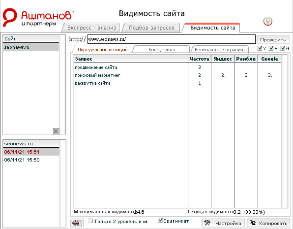Раздел «Видимость сайта» действует аналогично большинству утилит (siteposition, raznoves, liteweb, созданных для определения позиций сайта по запросам. Вводите интересующие запросы, указываете поисковые системы, в которых будут определяться позиции сайта, осуществляете сбор данных.(рис.3). Позиции определяются по многим запросам для одного сайта, но нет возможности собрать статистику по нескольким запросам сразу для нескольких сайтов.