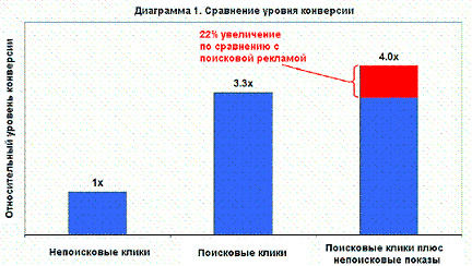 Общий обзор анализа В течение апреля 2006 года Atlas вел наблюдения за 11 рекламодателями, которые использовали и непоисковую, и поисковую рекламу. Была учтена изначальная конверсия каждого рекламодателя, а пользователи были поделены на группы сконвертированных и несконвертированных. При вычислении уровня конверсии повторная конверсия не учитывалась. История каждого пользователя была оценена и сегментирована на экспериментальные группы в зависимости от типа рекламы, с которой он взаимодействовал. Во время исследования было проанализировано более10,8 миллионов просмотров и 2,5 миллионов поисковых кликов от 1,8 миллионов пользователей.