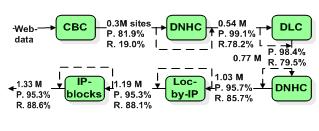 1. Данные и Методы В литературе можно найти много различных методов по использованию IP-данных о месте нахождения, доменных именах, контенте сайта (ссылки на информацию о расположении, например названия городов, телефонные коды городов, почтовые индексы) в геотаггинге (geotagging). Суть настоящего подхода заключается в наиболее эффективном сочетании множества источников географической информации. Для регистрации городов было разработано два метода, основывающихся на: •контенте сайта •данных сайта (доменное имя, IP- адрес). Рабочий процесс будет предполагать сочетание этих методов, как показано на Рис.1. Рассчитанные EMC точные (P) и выборочные (R) значения деклассифицированных сайтов, будут представлены для каждого этапа классификации. Пунктирные линии указывают на то, что результаты классификации объединены с исходными данными для последующего процесса, т.о. результаты классификации складываются в процессе работы.