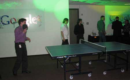 Встреча была организована в форме пресс-ланча, посвященного не только новоселью, но и первой годовщине деятельности компании в России. Гостей собрали в просторном зале нового офиса. Здесь, ожидая начала официальной части, можно было не только перекусить, но и поиграть в настольный теннис, футбол или дартс. А за чашечкой кофе - осмотреть многочисленные Google-doodles различных размеров, ненавязчиво развешенных по всему офису.