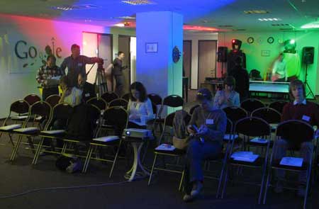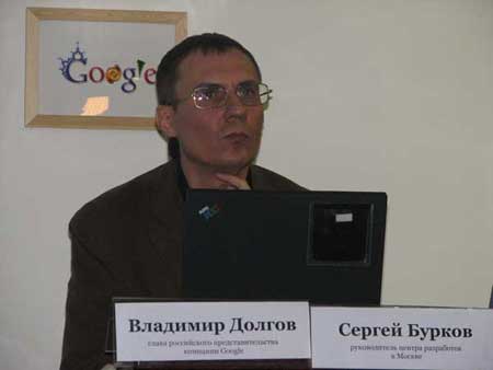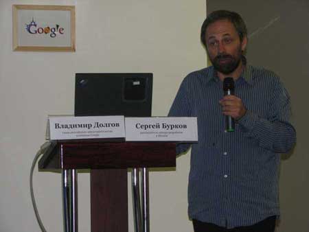 Первым слово держал Владимир Долгов, глава Google Russia.Он подытожил результат деятельность Google Russia за прошедшие месяцы, основными вехами которой стали: улучшение качества поиска и локализация более 15 продуктов – платежи Adwords для юридических лиц, Google новости, Google тулбар, мобильный поиск. Также Россия стала первой страной в Европе, где Google открыл свободную регистрацию в почтовой службе Gmail. Что касается поиска, Владимир отметил, что в его компетенции не только все существующие языки, но и язык «науки и философии», а также язык одной из вымышленных рас из «Звездных воин».