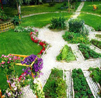 Этот тип оформления прямо противоположен прямоугольной схеме планировки, которая так и напрашивается сама при рассмотрении участка прямоугольной формы. Круглую форму можно придать любым элементам сада - газонам, дворикам, клумбам, лужайкам. Нужно лишь продумать, как они будут перекрываться и соединяться друг с другом. Если встречаются неизбежные прямоугольные, прямолинейные фрагменты, то в круглой планировке они маскируются специально подобранными растениями. Искусство дизайнера состоит в том, чтобы умело соединить и скомбинировать несколько таких круглых или кольцевых структур. В промежутке между изогнутыми линиями посадите растения, и вы получите стильный и оригинальный сад.