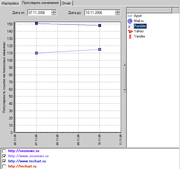 Модуль “Проверка популярности ссылок” позволяет в удобной графической форме сравнить динамику популярности ссылок собственного сайта и сайта-конкурента за определенный промежуток времени (количество ссылающихся) (рис.1).