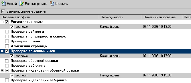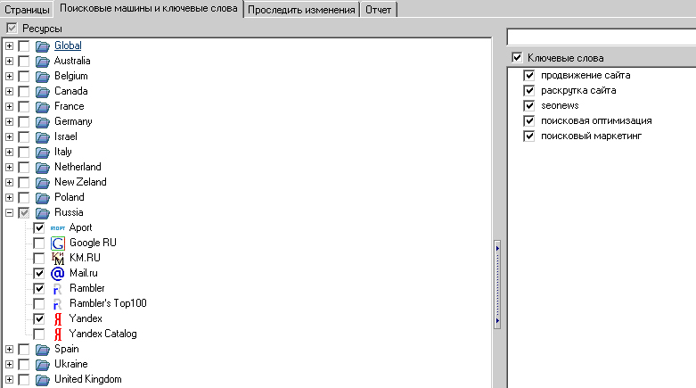 Стандартную задачу проверки позиций сайта в различных поисковых системах решает отдельный модуль. Впечатляет список поисковых систем, с которыми работает программа: от российских до австралийских (рис.2).