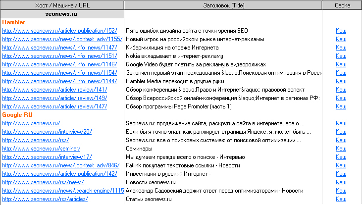Модуль “Анализ индексации сайтов” позволяет узнать, какие страницы сайта, ботами каких поисковых систем были проиндексированы (рис.3).