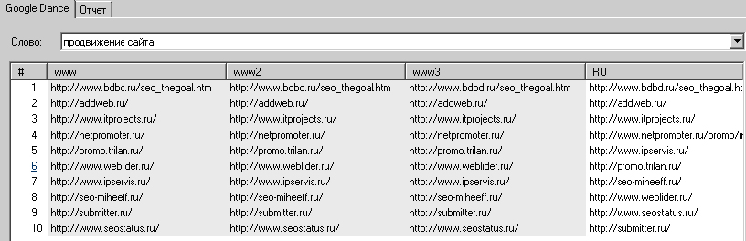 Модули “Исследование Google Dance” и “Проверка позиций сайта на датацентрах Google” будут полезны тем, кто профессионально занимается продвижением в Google. Получая информацию от датацентров Google, можно с достаточно большой степенью уверенности определять изменения позиций в будущем (рис.4).