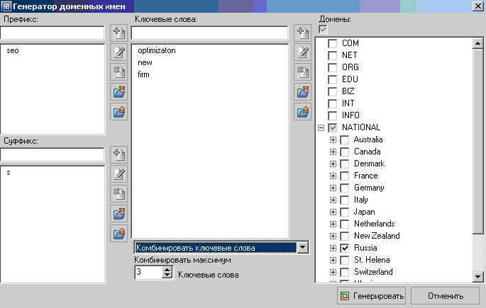 В модуль встроен специальный инструмент, позволяющий генерировать доменные имена из предложенного списка ключевых слов, префиксов и суффиксов (рис.5).