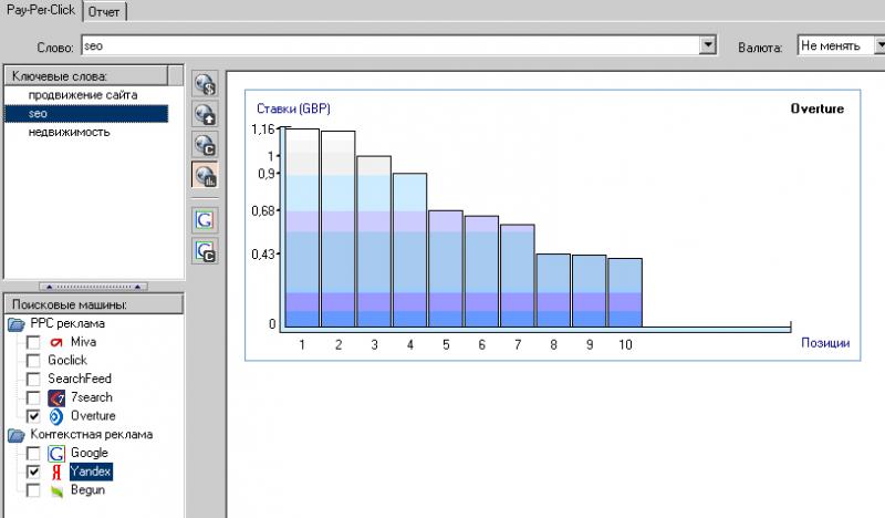 Модуль “Управление кампаниями PCC” выдает информацию о максимальных, минимальных и средних ставках на то или иное слово, выдается список сайтов, которые участвуют в данных кампаниях. В графической форме предоставляется информация о том, какие ставки установлены той или иной кампанией PPC, на определенную позицию (рис.6).