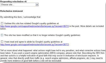В форме для запроса на повторное включение в выпадающем меню можно найти и выбрать удаленный сайт. Далее нужно отметить галочкой следующие поля: 1. Да, я был неправ. 2. Я пересмотрю свои действия. 3. Я знаю, что теперь нужно делать. Ниже можно написать в Google письмо, выражая свои извинения и раскаяния.