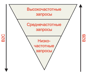 Через эмпирические исследования наши аналитики выяснили, что: B2С В случае, если компания работает в секторе b2c и хочет продвигать в целом общеизвестный продукт на не профессиональную и не определившуюся аудиторию, то лучше начинать поисковое продвижение с высокочастотных запросов и постепенно двигаться в сторону продвижения средне- и низкочастотных запросов. Пример: пластиковые окна. Производитель пытается продать непрофессиональному пользователю качественный многокамерный профиль от, например, немецкого производителя - KBE, а пользователь ищет всего-навсего теплые пластиковые окна. Если продвигать запрос "профиль КВЕ", покупатель не найдет продавца. Если запрос "пластиковые окна", всем будет счастье!