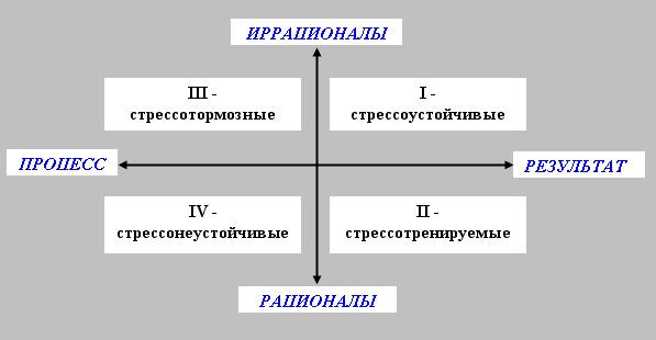 И, наконец, квадрант IV - рационалы, ориентированные на процесс. Люди, принадлежащие к этой группе больше всего подвержены воздействию стрессов - они стрессонеустойчивые. Они хуже всех переносят стрессы, особенно внезапного характера. Несмотря на внешний стоицизм, у них имеется плохо защищенная, уязвимая точка и, вместе с тем, потребность иметь прочную опору под ногами, внезапный удар по которой лишает их сопротивляемости. Втягивание в стрессовую полосу грозит им тяжелыми сомнениями, приводящими в итоге к внутреннему надлому. Тогда они похожи на "колосса на глиняных ногах". Даже, когда воздействие стрессовых факторов прекращается, они с трудом переключаются, психологически тащат стрессовое состояние за собой еще долгое время.