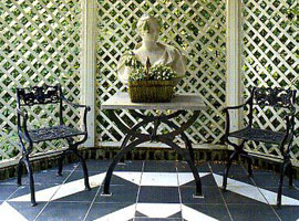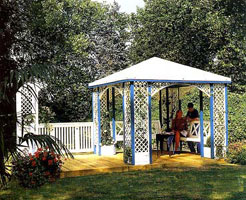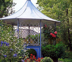 Но даже самые красивые беседки без вьющихся растений выглядят незавершенными. Поэтому в дополнение к садовым сооружениям фирмы предлагают соответствующий посадочный материал - клематисы, девичий виноград, каприфоль. Наиболее романтично смотрятся, разумеется, пышные лазящие розы. Для павильона на открытом солнечном месте прекрасной альтернативой может стать бело- или синецветковая глициния. Для пышного цветочного наряда в любом случае нужна надежная опора. Следует помнить, что это сооружение в первую очередь предназначено для людей и лишь во вторую - для растений. У беседки должна быть надежная крыша, зато остальные элементы конструкции можно использовать для поддержания лиан. Между столбами делают трельяжные решетки, а сами столбы покрывают сеткой или крючками.