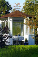 Обдумайте, как вы намерены использовать свою "тихую заводь". Если собираетесь проводить здесь жаркие дневные часы или теплые вечера, то вполне достаточно будет модели с полностью или наполовину открытыми стенами. Если же хотите иметь настоящий павильон, который можно использовать и в межсезонье, придется закрыть его со всех сторон. Большие окна создадут ощущение, что вы находитесь в окружении зелени. Хорошая теплоизоляция и встроенное отопление позволят комфортно чувствовать себя здесь и в прохладные дни. Здесь удобно работать или проводить досуг за любимым занятием, а при достаточной площади можно даже принять друзей или устроить детский праздник, если погода вдруг задумает сыграть с вами злую шутку.