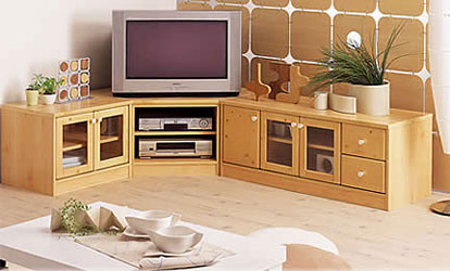 В инсталляции предметы, объединенные замыслом художника, соединяются между собой или просто ставятся рядом. На следующем фото низкая тумба для телевизора служит подставкой для инсталляции необычной формы деревянных предметов и керамических ваз.