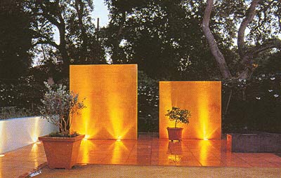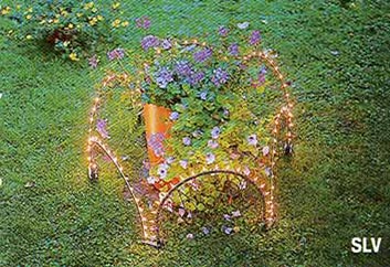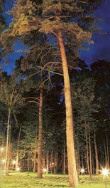 Одним из самых эффектных приемов является освещение растительности и малых архитектурных форм участка. Благодаря чему ландшафт обретает неповторимое «авторское звучание». Используются как минимум два основных освещения. С земли – это прожектора, переносные светильники на остром столбике типа «спайк». Подсветка сверху делается с применением осветительных приборов, не наносящих вреда растениям. Основное требование при использовании подсветки – «невидимость» осветительных приборов. Довольно популярно размещение в кроне деревьев гирлянд с малогабаритными лампочками, круглый год создающими праздничное «новогоднее» настроение.