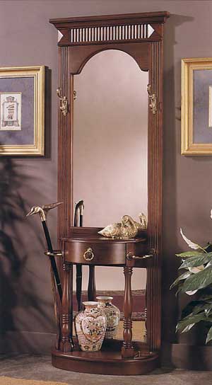 Подходящая мебель для прихожей и комоды. Они тоже могут быть навесными, а могут быть традиционно установлены на пол. В них можно упаковать большое количество всевозможных вещей от шарфов и перчаток до сумок и зонтов. Если вы любитель уютных интерьеров под старину, то на выполненный по образцу антикварного, комод можно поставить цветок, ларец или настольную лампу с абажуром из ткани, дающим мягкий свет. Тогда ваша прихожая станет похожа на холл в старом поместье, впечатление усилится от плитки имитирующий мрамор, уложенной на полу и картины с пейзажем в резной раме на стене.