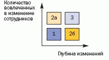 Классификация по принципу вовлеченности сотрудников (чем большее количество персонала вовлечено, тем более непопулярно решение) или глубины изменений (чем серьезнее изменения, связанные с принятием решения, тем более они непопулярны). Для большей наглядности представим иллюстрацию зависимости степени «непопулярности» решения от количества вовлеченных сотрудников и глубины изменений.