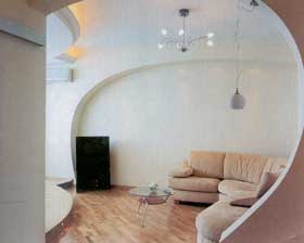 Округлые формы подиумов и каскадных потолков нашли продолжение в конфигурации арочного проема - прозрачной границы между холлом и гостиной, а также в объемном оформлении стены гостиной. Не ограничилось присоединением лоджий и стремление увеличить полезную площадь жилища. За cчет урезания неоправданного простора в коммуникационных коробах удалось расширить рабочую зону в кухне и выкроить достаточное место для душевой кабины в ванной комнате.