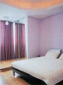 Необходимость утепления прежних зон лоджий в спальне и гостиной побудила к поиску другой интересной идеи. Возведение в утепляемых частях двух комнат подиумов и каскадных потолков привело к их значительному снижению. В качестве контрмеры потолок подсветили, и тем самым зрительно его, облегчили и приподняли вверх.