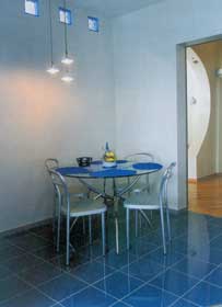 За счет увеличения гостиной на примерно такую же квадратуру удалось расширить кухню, в которой на добавленном в результате перепланировки пространстве разместилась столовая группа. Дизайнер нашел интересное решение кухонного интерьера. Для зонирования был использован, и весьма успешно, прием "выворотки": синяя кухня - на сером полу, обеденный стол и стулья, цвета серого металлика - на синем полу. Кухня получилось легкой, изящной, прозрачной.