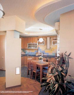 С помощью подобной необычной конструкции Гостиная отделена от кухни и в то же время оба помещения воспринимаются как единый объем. Удачно и композиционное решение, позволяющее сохранить стилевое единство интерьеров и вместе с тем ненавязчиво отделить жилую зону квартиры от вспомогательных помещений. Извилистая граница между паркетом в жилой зоне и кобальтово-синей плиткой из керамического гранита в коридоре и на кухне повторяет плавные очертания подвесного потолка - словно облака отражаются в воде. Смелое цветовое решение отлично сочетается со сложными геометрическими формами декоративных элементов.
