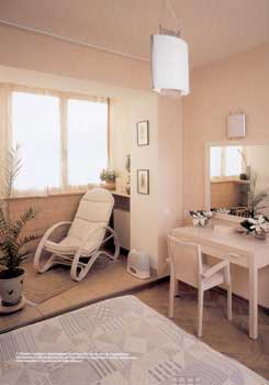 В результате в супружеской спальне появилась миниатюрная зона отдыха, где разместились кресло и живые растения. "Территория блаженного безделья" отделена от спальни символической ступенькой. Пол и даже подоконник (еще одна дизайнерская находка!) в бывшей лоджии облицованы керамической плиткой теплого терракотового цвета, которая превосходно сочетается с песочными стенами и с подобранной хозяевами светлой мебелью подчеркнуто строгого дизайна.