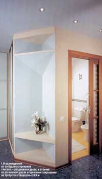 Театр, как известно, начинается с вешалки, а квартира - с прихожей. Единственный предмет обстановки в этом помещении - встроенный шкаф, по определению более "компактный", нежели корпусная мебель. Его двери сделаны из матового стекла, поэтому шкаф совсем не кажется громоздким. В размещенном по соседству гостевом санузле - раздвижная дверь; в отличие от распашной для ее открывания-закрывания не требуется стандартных 0,9 м.
