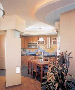 Потолки сложной формы также выполнены из гипсокартона. Плавное очертания подвесных элементов и обилие подсветки ассоциируются с неспешно плывущими в летнем небе полупрозрачными облаками. Легкость и свобода дизайнера в обращении с гипсокартонном просто завораживают: из этого материала выполнены практически все декоративные элементы в квартире, но ощущение нарочитости композиции ни в коем случае не возникает. "Скульптурные" детали кажутся очень органичными и практически невесомыми, словно они выполнены из бумаги, принявшей необходимую форму по воле мастера оригами.