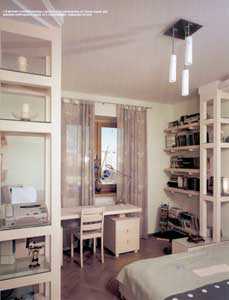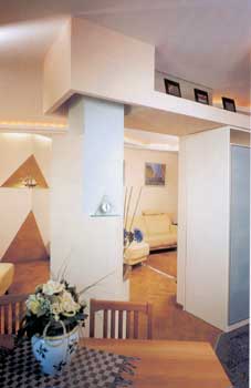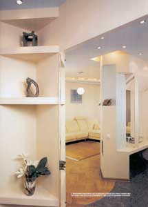 Самая интересная деталь гостевой части квартиры - оригинальный шкаф из гипсокартона, изготовленный, как и все остальные элементы, специалистами из "Сигнала". Он заменил снесенную межкомнатную перегородку, разделявшую в первоначальном варианте планировки гостиную и кухню. "Шкафом" эту великолепную дизайнерскую находку можно назвать только в том случае, если необходимо четко обозначить ее функцию. На самом деле шкаф представляет собой изящное ажурное сооружение, служащее украшением интерьера. Встроенная в него система хранения видна только из кухни; с другой стороны шкафа устроены ниши, стеклянные полки и антресоль, внутренняя поверхность которой отделана зеркальными плитами. Композицию дополняют встроенные и настенные светильники.