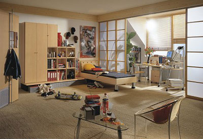В молодежных интерьерах для зонирования можно использовать подиум, на котором разместить <спальную зону>, а заодно и решить проблему хранения вещей внутри подиума. Очень удобны в таких интерьерах и всевозможные трансформеры: раздвижные перегородки, трансформируемая мебель, передвижные конструкции.