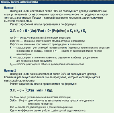 Если переменная часть привязана к выполнению плана (например, по отгрузкам), большую роль играет то, каким образом происходит формирование месячного плана по объему продаж и приходу денежных средств от них. Когда плановые показатели спускаются сверху, более чем вероятно, что они будут завышены, а это влечет за собой неминуемое снижение переменной части в связи с невыполнением поставленной задачи.